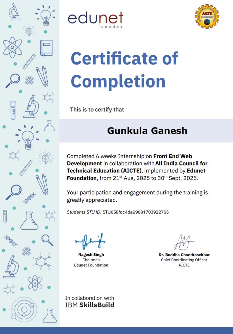I have successfully completed a 6-week Internship on Front-End Web Development, conducted by Edunet Foundation in collaboration with All India Council for Technical Education (AICTE) and IBM SkillsBuild.