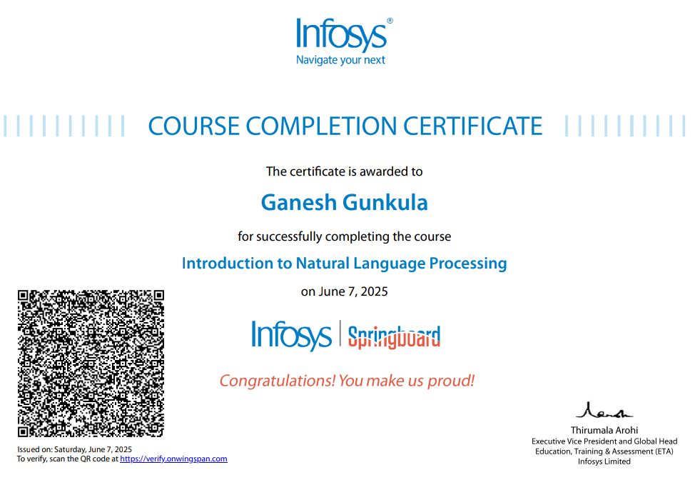 Successfully completed an NLP course covering text preprocessing, tokenization, classification, and application of Natural Language Processing techniques in real-world projects.